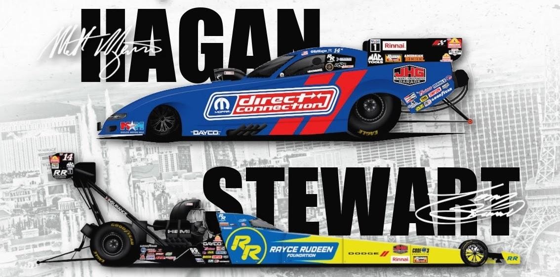 • Stewart enters Las Vegas representing the Rayce Rudeen Foundation on his blue and yellow Top Fuel dragster. Hagan, meanwhile, sports red and blue colors of Dodge Direct Connection on his Dodge//SRT Hellcat Funny Car.